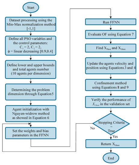 The flowchart of the implemented training approach is presented in Figure 5. This scheme generally illustrates the various steps, starting with dataset processing where the input dataset was normalized between −1 and 1, using the min–max normalizations method, thus ensuring a mean of 0 and a standard deviation of 1. Additionally, the input dataset was divided into two sets: the training set () and the validation set (), corresponding to 75% and 25% of the data, respectively. Subsequently, all the variables and parameters were initiated, namely, the lower and upper bound (xlb and xub), the number of agents in the population, maximum number of iterations, and PSO control parameters.