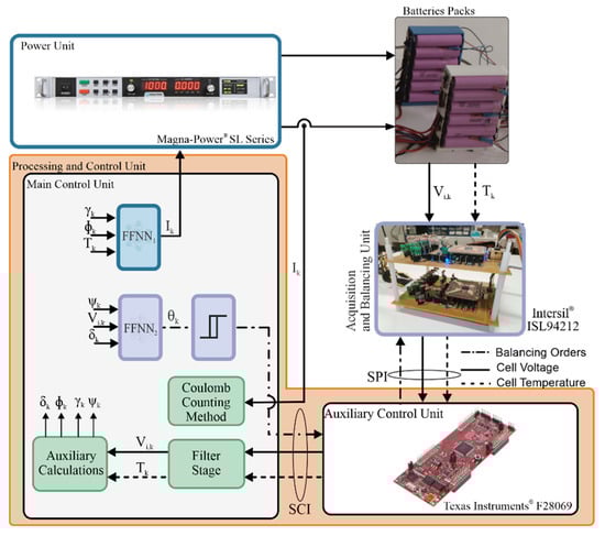 The implemented system can be divided into the following three fundamental blocks: processing and control unit; acquisition and balancing unit; power unit. The implemented hardware blocks are shown in Figure 6. The processing and control unit can be subdivided into the following two distinct units: the main control unit and the auxiliary control unit. The main control unit algorithms were implemented in Mathworks Matlab® software running on a desktop workstation. This type of centralized control architecture allows great flexibility in the development of new charging algorithms with cell balancing strategies.