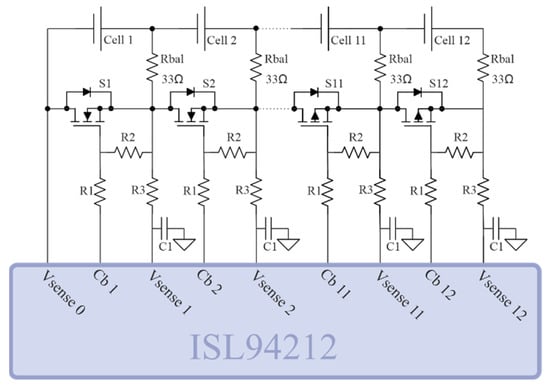There are two distinct methodologies for balancing Li-ion battery cells, as follows: active and passive methodologies. In passive methodologies, cells are balanced by discharging when the cell or pack is not being used, or by providing an alternative path for current flow during the charge operation. There are several distinct passive methodologies for Li-ion battery cells, such as the fixed shunt resistor, the shunt resistor, complete shunting, and the switched shunt resistor [,,,]. Passive methodologies are widely used due to their simplicity, cost, efficiency, volume, weight and robustness [].