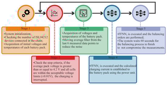 - Stage 1. In this stage, all the system variables are initialized, and all the communication ports are configured. Additionally, the number of ISL94212 devices connected in the chain is checked and the initial voltages and temperatures of each battery pack is acquired.