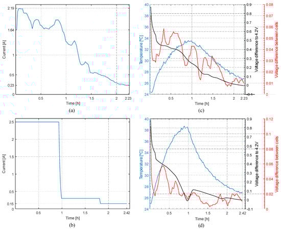 Figure 9 presents the charging current profiles, the battery pack temperature, the difference between the full charge voltage and the average cell voltage of the pack and, finally, the maximum difference between cell voltages, for both experimental tests. For the proposed algorithm, the current had an initial value of 1.64 A (Figure 9a), due to a considerable difference between the cell voltages of 0.07 V (Figure 9b). After 4 min and 40 s, the current reached the maximum value of 2.18 A, due to a decrease in the difference between cell voltages (0.03 V at that moment). During the remaining charge, there was an oscillatory profile in the current. This is justified by the difference between cell voltages, i.e., when there is an increase in the cell voltage difference, there is a decrease in the charge current, and vice versa. Although there was a slight difference between cell voltages during the entire charging process, this difference was gradually reduced as the charging progressed, ending the charging process with a value of 0.01 V. As seen in Figure 9c, the difference between the full charge voltage and the average cell voltage followed the expected profile, i.e., a gradual decrease until the end of the charge, with steeper slopes when the charging current was higher. Additionally, the temperature did not exceed the predefined values for the cells, reaching a maximum value of only 33.59 °C, corresponding to a 9.28 °C temperature variation.