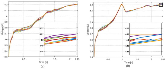 Figure 10 shows the individual voltage of each cell in the pack for both experimental tests. As aforementioned, in the tests performed with the proposed algorithm (Figure 10a), the difference between cell voltages decreased towards the end of charging. The magnification of this final stage (in Figure 10a) clearly reveals how the charging process was completed successfully, fulfilling the stopping criteria with an average cell voltage of 4.203 V and a difference between cell voltages of 0.01 V. In contrast, in the experimental test with the multistage method (Figure 10b), there was a reduced difference between cell voltages throughout the charging process and there was a higher slope in voltage until the first transition, which is justified by the high charging current of 2.5 A. The zoom in Figure 10b shows the fulfillment of the stopping criteria (an average cell voltage of 4.202 V and a difference between cell voltages of 0.01 V), confirming once again the excellent results obtained by the proposed balancing algorithm.