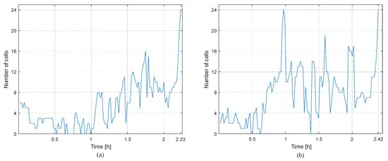 Figure 11 illustrates the number of cells that required balancing during the charging process for both experimental tests, demonstrating the excellent performance of the proposed balancing algorithm using the FFNNs. For the proposed algorithm, after 1 h and 30 min of charging there was an increase in the number of cells that required balancing (Figure 11a), since the proposed algorithm privileges top balancing, making the balancing process more stringent at the end of the charging process. Before 1 h and 30 min of charging, few cells needed to be balanced, because balancing in this period is not very effective (compared with balancing performed at end of charging) and is only carried out to mitigate and prevent a higher difference between cell voltages. At the end of the charging process and since the stopping criteria were not met, all cells exceeded 4.2 V and, consequently, all cells were balanced. This procedure is essential to prevent cell voltage from further exceeding the full charge voltage (4.2 V) and allowing the stopping criteria to be met (Equations (10) and (11)).