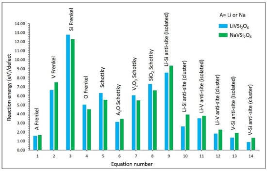 Figure 2 shows the calculated reaction energies for LiVSi2O6 and NaVSi2O6. The most dominant defect process was the V–Si anti-site defect cluster in both materials. This indicates that there will be a small concentration of V on the Si site and Si on the V site simultaneously. The isolated form of this defect is higher in energy than its cluster form. This is because of the exothermic binding of isolated defects. Previous experimental and theoretical studies have highlighted the presence of anti-site defects in various oxide materials [54,55,56]. The Li–V and Li–Si anti-defect cluster energies are higher than that of the V–Si anti-site defect cluster. This is due to the higher cation charge mismatch (Li–Si or Li–V). The Li (or Na) Frenkel was found to be the second most favourable defect. This process would expect an increase in the concentration of Li or Na vacancies, which enhances the vacancy-assisted Li or Na diffusion. The Li2O (or Na2O) Schottky defect is the lowest energy process among other Schottky processes. This defect process will degrade the as-prepared material, affecting the performance of batteries. Other Frenkel defects exhibit higher formation energies than the Li (or Na) Frenkel.