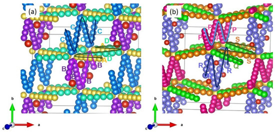 Migration pathways (a) Long-range Li-ion migration pathways (B→ B→ B→ B, C→ C→ C→ C and A→ D→ A→ D) in LiVSi2O6 and (b) long-range Na-ion migration pathways (P→ P→ P→ P, R→ R→ R→ R and Q→ S→ Q→ S) in NaVSi2O6.