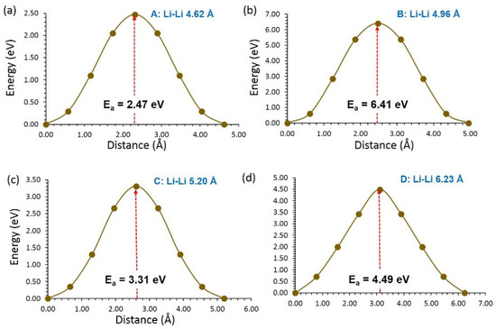 Four different possible Li local hops (A, B, C and D) were identified in LiVSi2O6 (see Figure 3a). Local Li hops together with activation energies are provided in Table 3. Hops A and D formed a long-range Li migration pathway (A→ D→ A→ D) with a zig-zag pattern in the ac plane. Activation energies for these hops were 2.47 eV and 4.49 eV, respectively, meaning that long-range migration requires an overall activation energy of 4.49 eV. A long-range Li migration pathway consisting of local hop B (B→ B→ B→ B) is observed in the bc plane. The overall activation energy for this pathway is 6.41 eV. A potential Li–Li hop (C) with a jump distance of 5.02 Å was also identified. This local hop forms a long-range diffusion pathway (C→ C→ C→ C) in the bc plane with a net activation energy of 3.31 eV. Energy profile diagrams plotted to calculate activation energies for Li-local hops are shown in Figure 4. Although this long-range pathway has the lowest overall migration energy, the diffusion of Li-ions in this material is expected to be very slow.