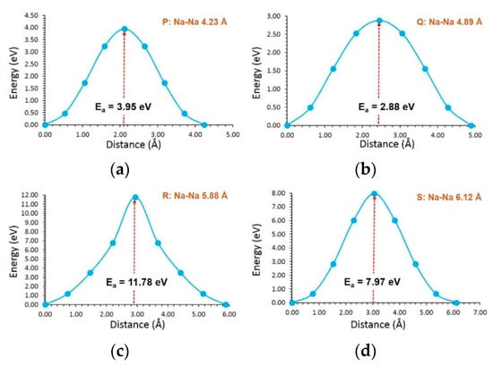 For Na-ion migration in NaVSi2O6, four local hops (P, Q, R and S) were identified. These hops were then allowed to construct long-range migration pathways, as shown in Figure 3b. In general, activation energies were higher than that calculated for Li-ions in LiVSi2O6 (see Table 3). This can partly be due to the ionic radius of Na+ (1.02 Å) being larger than that of Li+ (0.76 Å) [60]. A long-range Na-ion pathway (P→ P→ P→ P) exhibits an activation energy of 3.95 eV. This pathway can be directly compared with the long-range Li-ion pathway in LiVSi2O6 (C→ C→ C→ C). In both LiVSi2O6 and NaVSi2O6, the lowest ion migration pathway is the same. Although hop Q has the lowest activation energy of 2.88 eV, this hop should be combined with hop S to induce long-range diffusion. The overall activation energy for this diffusion pathway is 7.97 eV (see Table 3). The local hop R exhibits a very large activation energy of 11.78 eV. This can partly be due to the presence of V in that particular zig-zag plane. Figure 5 shows energy profile diagrams calculated for each local Na hop in NaVSi2O6.