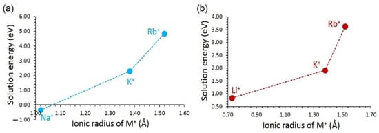 An exoergic solution energy of –0.35 eV was determined for Na+ in LiVSi2O6 (see Figure 6a). This is partly due to the ionic radius of Li+ (0.76 Å) matching with the ionic radius of Na+ (1.02 Å) [60]. It is possible to synthesise Li1−xVSi2O6 (0.0 < x < 1.0). However, the exact concentration should be verified experimentally. The solution energy increases with the increasing ionic radius. The largest solution energy is calculated for the Rb+. In the case of NaVSi2O6, the most favourable dopant is Li+. The solution energy for this dopant is 0.83 eV. Although this dopant is not thermodynamically feasible, the doping process can be performed at high temperatures. Solution energies for K+ and Rb+ are higher than that calculated for Li+ due to their larger ionic radii than that of Li+.