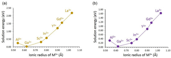 Solution energies are shown in Figure 7. In both LiVSi2O6 and NaVSi2O6, the most favourable dopant is Ga. The preference of Ga in both materials is due to the close ionic radius match between V3+ (0.64 Å) and Ga3+ (0.62 Å) [60]. Al exhibits positive solution energies in both materials, although its ionic radius (0.54 Å) is smaller than that of V3+. The solution energy increases with the increasing ionic radius from Sc to La. A similar trend in the solution energies is noted for both materials, although the solution energies are slightly lower in LiVSi2O6 than in NaVSi2O6. The most unfavourable dopant is La3+.