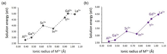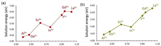 The oxygen vacancies can promote vacancy-assisted Li or Na migration via Li2O or Na2O formation. Al3+ is a suitable dopant for this as well (see Figure 9). The trend in the solution energies is almost the same as that observed for the formation interstitials (see Figure 8). The solution energies are higher by ~1.50 eV for each dopant than that calculated for interstitials, meaning that high temperature should be applied for the oxygen vacancy formation process.