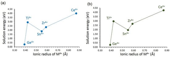 The results show that the most favourable dopant for this process is Ge4+ (see Figure 10). The favourability of this dopant is due to the smaller ionic radius of Ge4+ (0.39 Å), closer to that of Si4+ (0.26 Å). There is a big jump in the solution energy for Ti4+. Solution energy then increases with the increasing ionic radius. Both LiVSi2O6 and NaVSi2O6 exhibit almost similar solution energies. The possible composition that can be prepared by experiments is LiVSi2-xGexO6 or NaVSi2−xGexO6 (x = 0.0 < x < 1.0). The largest solution energy is calculated for Ce4+, suggesting that this dopant requires high temperatures. The migration of Li-ions was calculated in the presence of Ge4+ dopant. The doping was reflected in the activation energies of local hops. In all cases, there were small reductions in the activation energies (LiVSi2O6: A-4.53 eV, B-4.88 eV, C-5.10 eV and D-4.40 eV; NaVSi2O6: P-3.89 eV, Q-2.80 eV, R-11.67 eV and S-7.90 eV). In all cases, long-range diffusion pathways were unaffected.