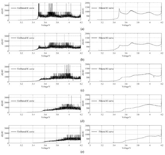 IC curve under different SOH: (a) SOH = 100%, (b) SOH = 95%, (c) SOH = 90%, (d) SOH = 85%, (e) SOH = 80%.