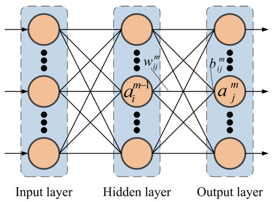 The BP neural network is divided into three layers: input layer, hidden layer, and output layer, as shown in Figure 4. In Figure 4, represents the output of the ith node of the mth layer.