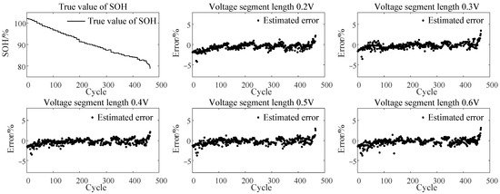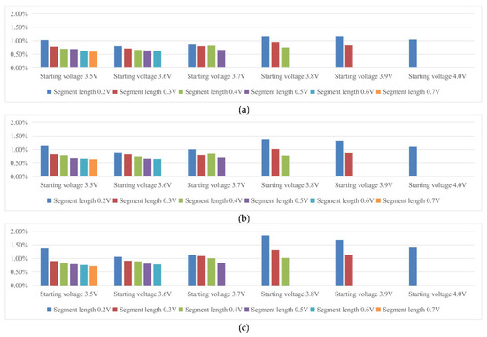 Comparing Figure 6a–c, we can see that the larger the sampling interval of the IC curve, the larger the MAE of the SOH estimation. Although the sampling interval of the IC curve is smaller, it is more conducive to accurately estimate the SOH, but it also leads to an increase in the sampling points of the IC curve, which will greatly increase the amount of calculation. For example, when the sampling interval is 0.05 V and the IC curve voltage segment length is 0.4 V, there are only eight sampling points of the IC curve, and only eight nodes are required for the input layer of the BP neural network. When the sampling interval is 0.01 V and the IC curve voltage segment length is 0.4 V, the number of samplings points of the IC curve and the number of input layer nodes of the BP neural network are both increased to 40. This greatly increases the training difficulty and training time of the BP neural network. Therefore, the selection of sampling interval needs to comprehensively consider the accuracy of SOH estimation and the amount of calculation.