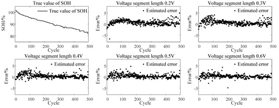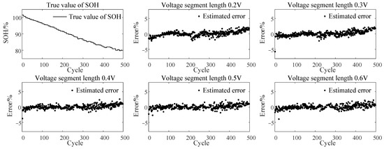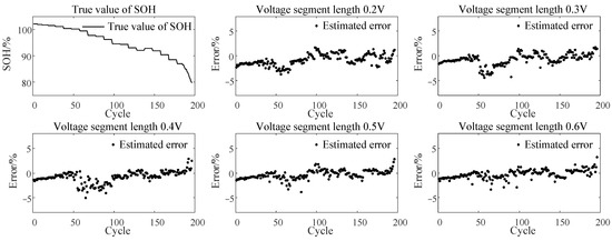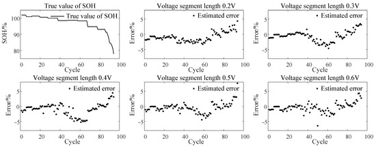 Figure 7, Figure 8, Figure 9, Figure 10 and Figure 11 shows the SOH estimation results of the full life cycle under different voltage segment lengths and different battery discharge conditions when the sampling interval is 0.02 V and the starting voltage of the IC curve is 3.6 V. It can be seen that, as shown in Figure 7 and Figure 8, after the battery is discharged at 0.5 and 1 C, the IC curve in the CC charging process is used to estimate the SOH and obtain good estimation accuracy in the full life cycle. For the battery after high-rate discharge, as shown in Figure 9 and Figure 10, although the BP neural network can track the trend of SOH changes, in some cycles, the prediction error is relatively large. For the WLTC operating condition that simulates the actual discharge conditions of EVs, the method proposed in this article can more accurately estimate the SOH, as shown in Figure 11. In addition, Figure 7, Figure 8, Figure 9, Figure 10 and Figure 11 also compares the SOH estimation results when the sampling interval is 0.02 V and the IC curve starting voltage is 3.6 V, the same battery discharge conditions, and different voltage segment lengths. The overall trend is that the longer the length of the voltage segment of the IC curve, the more accurate the SOH estimation.