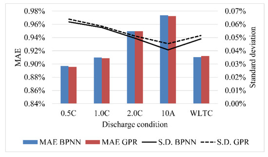 It can be seen from Figure 13 that no matter what the discharge conditions, the MAE performance of the two methods is not much different. The SOH estimation method based on GPR has only a minimal advantage in accuracy. In addition, even in the case of high current (10A) discharge, the MAE of the two methods is less than 0.98%. In terms of the standard deviation of the estimation error, the SOH estimation method proposed in this paper has small advantages, and the SOH estimation result is more stable.