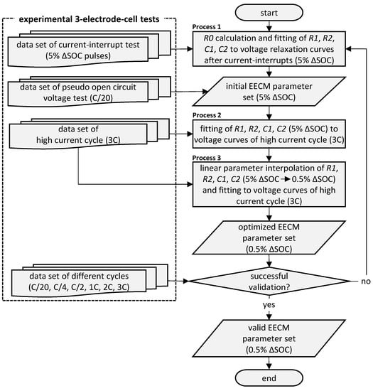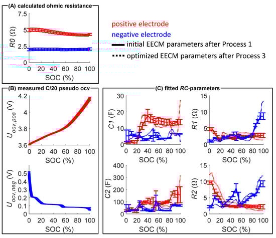Process 1: As illustrated in Figure 2, this parameterization approach needs different experimental data from 3-electrode cells, with a lithium reference electrode between the negative and positive electrodes. For this study, the experimental current-interrupt test started at 0% SOC and was subdivided by 0.5C charge pulses (5% ∆SOC), which were followed by current-less relaxation phases of 1 h, respectively. The Coulombic SOC of the cell does not change during the current-less relaxation phase, which enables the Coulombic SOC-dependent determination of the parameters. The instantaneous change of the electrode voltages after stopping the current pulse for the relaxation at different SOC allowed the calculation of the ohmic resistances R0neg(SOC) and R0pos(SOC) by Ohm’s Law. The specific electrodes’ R1(SOC), R2(SOC), C1(SOC) and C2(SOC) were obtained by fitting the measured electrode voltage curves during relaxation to the exponential equations of the RC branches. This fitting procedure (see Process 1 in Figure 2) is performed by the MATLAB Curve Fitting Toolbox [] using the nonlinear least-squares method with Trust-Region algorithm and was already described in detail in our previous study [].