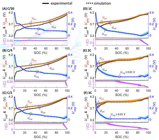Validation of different experimental charge cycles of seven 3-electrode-cells and the simulation data based on the optimized model parameters. The voltages of both electrodes (Upos and Uneg) are measured versus the lithium reference electrode, whereas the cell voltage (Ucell) is the differential voltage of the electrodes. (A) C/20 CC charge. (B) C/4 CCCV (CV at 4.1 V Ucell until I < C/20). (C) C/2 CCCV (CV at 4.1 V Ucell until I < C/20). (D) 1C CCCV (CV at 4.1 V Ucell until I < C/20). (E) 2C CC; CV at 0.01 V Uneg until 80% SOC, then C/2 CCCV (CV at 4.1 V Ucell until I < C/20). (F) 3C CC; CV at 0.01V Uneg until 80% SOC, then C/2 CCCV (CV at 4.1 V Ucell until I < C/20). The charge cycles (E,F) have online controlled CV charge cycles for the negative electrode, in order to prevent lithium-plating due to high negative potentials.