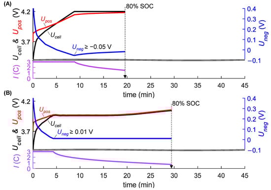The state-of-the-art fast-charging strategy 3C(CCCV) results in a charging time of about 20 min until 80% SOC but leads to negative voltages of the negative electrode down to −0.05 V at the end of the CC-phase. The optimized fast-charging strategy 3C(EECM-opt) needs about 29 min until 80% SOC. The charging time range of the two strategies between 20–29 min for 0–80% SOC is in good accordance with other minimum fast-charging durations for lithium-ion batteries from the literature [,].