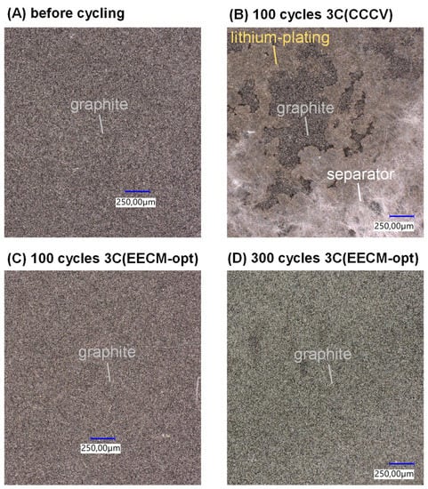 Optical post-mortem inspection (100× zoom) of the negative electrodes under argon atmosphere. (A) There is no visible lithium-plating before cycling. (B) The 3C(CCCV) strategy leads to lithium-plating during the first 100 cycles, which is partly attached to separator fibers. (C) The optimized strategy 3C(EECM-opt) does not lead to visible lithium-plating after 100 cycles. (D) The optimized strategy 3C(EECM-opt) does not lead to visible lithium-plating after 300 cycles.