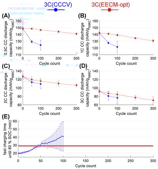 Before and during the cycling, the cells were periodically characterized with different discharge rate tests from 0.5C CC to 3C CC at different cycle counts (0, 50, 100, 200 and 300 cycles) in order to determine the capacity retention. The specific discharge capacity retention after different cycle counts and different current rates are depicted in Figure 7A–D, whereas Figure 7E illustrates the course of the different fast-charging durations of 3C(CCCV) and 3C(EECM-opt).