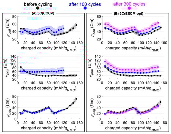 Figure 8 illustrates the specific resistances ρ over the charged capacity during the current-interrupt test, between 5–95% SOC at different cycle counts for both fast-charging strategies.