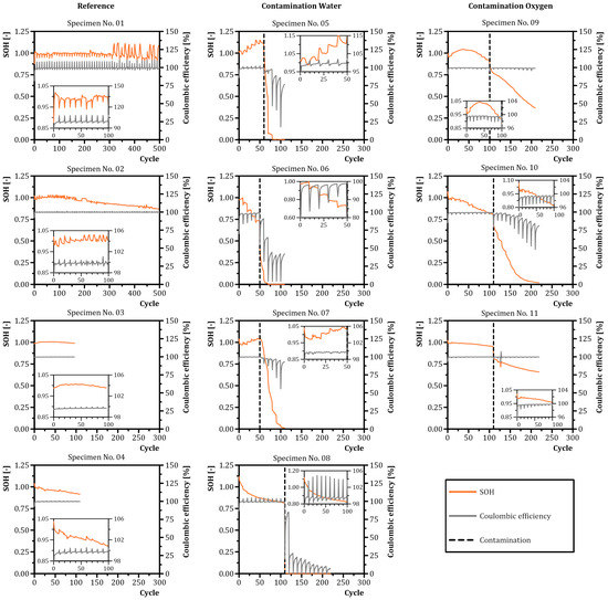 Figure 6 illustrates the SOH and Coulombic efficiency during cycling for different contamination types. Reference specimens No. 01 and No. 02 were subjected to 500 cycles to investigate the aging effects during cycling. Specimen No. 01 indicated peaks in the Coulombic efficiency and drops in the SOH each 10 cycles. A similar behavior was observed for reference specimen No. 02. Reference specimen No. 03 showed no relevant changes in electrochemical behavior in terms of SOH and Coulombic efficiency for 97 cycles. After 97 cycles, specimen No. 03 indicated faulty measurement values with a Coulombic efficiency exceeding 100%. These data were excluded in further analysis. The SOH of reference specimen No. 04 linearly decreased at a consistent Coulombic efficiency of approximately 100%. After contamination with water, a fast drop in the SOH of specimens No. 05 to No. 08 was observed. The Coulombic efficiency showed an erratic course for specimens No. 05, No. 06 and No. 08. Specimen No. 07 had a smooth Coulombic efficiency course before water contamination, changing to an erratic course after contamination with sharp drops each 10 cycles. The Coulombic efficiency dropped for specimens No. 06 and No. 08 after water contamination. Specimens No. 05 and No. 07 reached a Coulombic efficiency of almost 100% even for the electrochemical cycles after contamination. Specimens No. 05, No. 06 and No. 07 showed an erratic course of SOH before contamination with peaks or drops each 10 cycles. The SOH of specimen No. 08 constantly decreased before contamination. After contamination with oxygen, a sharp drop in SOH of specimens No. 09 to No. 11 was observed, followed by a constant decrease in SOH. Specimens No. 10 and No. 11 showed a similar effect as specimen No. 04 (reference specimen equipped with ZrO2 plate) with a linear decrease in SOH before contamination at a consistent Coulombic efficiency. Specimen No. 09 showed a raising capacity until a peak was reached after 39 cycles and decreased for further cycles before contamination. The Coulombic efficiency stayed almost constant for specimen No. 09–No. 11. After contamination, the Coulombic efficiency of specimen No. 10 started to decrease with sharp drops each 10 cycles.