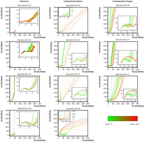 The reference specimens No. 01–No. 03 indicated minor changes during cycling. Minor changes of the intercept with the abscissa were observed during cycling. Specimen No. 04 showed increased semicircle diameters after 20 cycles (loop 2) with minor changes during further cycling. Noise was observed for specimens No. 01 and No. 04 at low frequencies indicated by a zig zag curve. Specimens contaminated with water (No. 05–No. 08) showed an increase in diameter of the second semicircle after contamination. Specimens No. 05 and No. 06 indicated changes in the intersection with the abscissa. Specimen No. 05 indicated a shift of the intersection with the abscissa towards higher values. Specimen No. 06 had a shift towards lower values after contamination increasing afterwards (loop 9). Additionally, reduced slopes of the linear part of the impedance spectra in the low frequency range were observed after contamination. Specimens No. 07 and No. 08 indicated minor changes of the intersection with the abscissa. Specimens No. 09–No. 11 contaminated with oxygen showed slighter changes in electrochemical behavior compared to the specimens contaminated with water. The intersection with the abscissa did not change to a relevant extent after contamination. The intersection with the abscissa shifted towards higher values for specimen No. 11 at 10 cycles after contamination (loop 11) that faded after 20 further cycles (loop 13). The diameter of the first semicircle slightly increased before contamination and significantly afterwards for specimens No. 09–No. 11. The degenerated second semicircle of specimens No. 09 and No. 11 flattened after contamination. The slope of the linear part of the impedance spectra in the low frequency range decreased for specimens No. 09–No. 11.