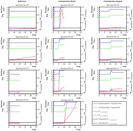 The right column “Contamination Oxygen” in Figure 9 shows the data for specimens with oxygen contamination (specimens No. 09–11). The algorithm falsely assigned a contamination with water for specimen No. 11, but changed to the correct value, indicating a contamination with oxygen one loop later. The assignment of the algorithm for specimens No. 09 and No. 10 was correct.