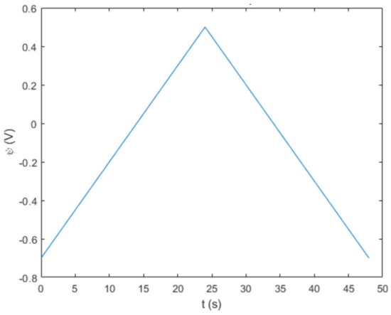In a potential sweep, just like how it is conducted in the laboratorial execution, potential varies linearly with time under a specific scan rate (ν) measured in Vs-1. The higher the scan rate, the higher the speed at which the experiment’s voltage varies. The overall potential sweep will increase from an initial value to a final value, upon which the sweep will be reversed (backward sweep) back to the initial voltage. The minimum and maximum potential, ψmin and ψmax, define the potential window (Δψ) and the shape of a potential sweep can be observed by plotting it in a function of time (Figure 1). The total duration of the sweep (tCV) can be obtained with Δψ and ν by using Equation (1). The potential throughout time can then be defined in two domains, as calculated, and presented in Equation (2).