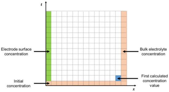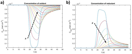 Equation (11) is applied to both oxidant and reductant concentration gradients by taking initial and boundary conditions that will respectively be the first values used by Equation (10). This system can be observed in Figure 2.