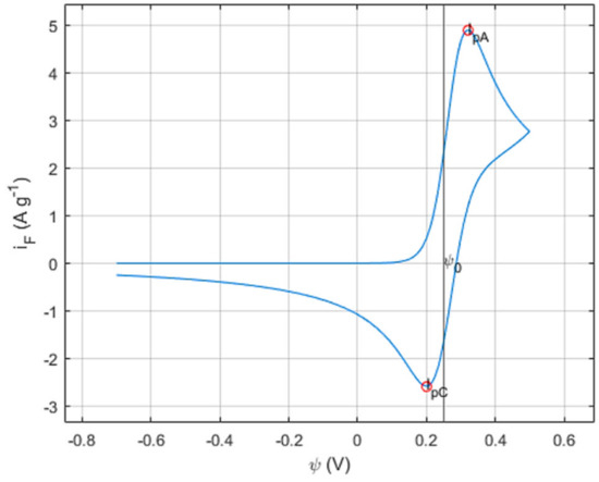 The capacitive contribution of the double-layer effect in the pseudocapacitor can be included and approximated to the behavior of an ideal capacitor (Equation (26)) with the sum of the capacitive current density, iC (A/g) to iF, obtaining the total current density, iT, in Equation (27).