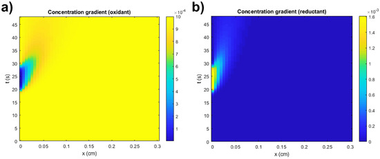 Simulated concentration gradients of (a) oxidant and (b) reductant.