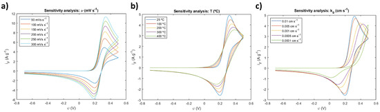 Temperatures of 25, 100, 200, 300, and 400 °C were imposed in the simulation parameters, and the following sensitivity analysis present in Figure 6b was conducted. As the temperature increased, the distance between peaks decreased as the CV curves flattened. This behavior is mathematically expected within the scope of the simulation considering the placement of the temperature term in the Butler–Volmer expressions (Equations (5) and (6)) that translate into an Arrhenius type of exponential response that will always decrease with higher temperatures. From an experimental perspective, it is well-reported in the literature [26] that increasing the temperature will facilitate the overcoming of the activation energy necessary for the exchange of charged species, reducing the hysteresis of the electrochemical response. This smoothing of the CV curve peaks is noticeable in Figure 6b by the less steep evolution of the current intensity towards the peaks, indicating the involvement of more easily achieved energetic states.