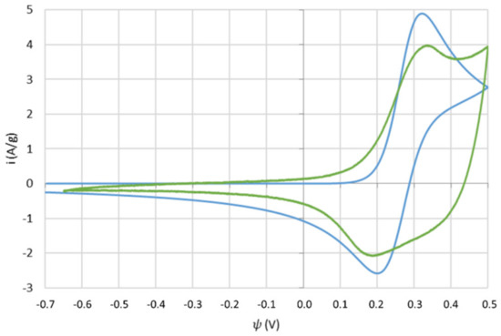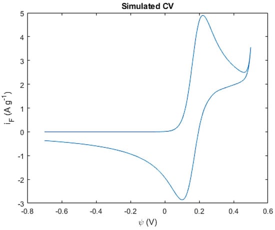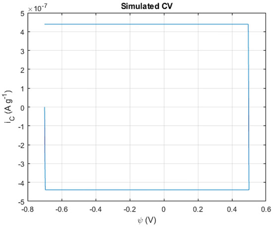 To evaluate the capacitive contribution in the Co(OH)2/CoOOH system, an extra step of the simulation was added, in which the ideal capacitor approximation stated by Equation (26) was assumed, leading to the pure capacitive CV curve observed (Figure 7).