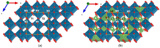 Li diffusion in the crystal structure of TiNb2O7 is anisotropic. As shown in [13], lithium is capable of rapidly migrating through T1 and T2 tunnels along the b axis within the (3 × 3)∞ block (Figure 1), which determines the high-rate capability of TiNb2O7. In addition, cross-tunnel diffusion is possible within the block, but diffusion between blocks is negligible [13].