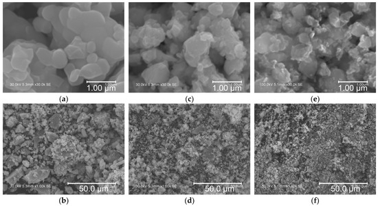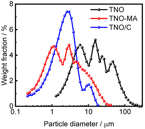Microstructural analysis of the as-prepared TNO, TNO-MA, and TNO/C samples was carried out by SEM (Figure 3). The particles of TNO had an irregular morphology with a submicron particle size, as is typical for mechanochemically prepared materials. It was possible to distinguish small primary particles of about 500 nm in size, along with larger micron-sized agglomerates of smaller primary particles. The particle sizes of TNO-MA and TNO/C were noticeably smaller than those of pristine TNO and were equal to about 350 nm. Figure 4 shows the particle size distribution for these three samples as measured by a particle size analyzer. Several maxima ranging from 5 to 50 μm were observed on the histogram of TNO with D50 = 12.4 μm. After MA, the particle size decreased to 1–10 μm with D50 = 2.13 μm. For the carbon composite TNO/C, the narrowest particle size distribution was observed with D50 = 2.22 μm. Thus, the short-time MA of TNO with or without carbon black significantly reduced the particle size. The addition of carbon black contributed to a more uniform particle size distribution, which agreed well with the SEM results.