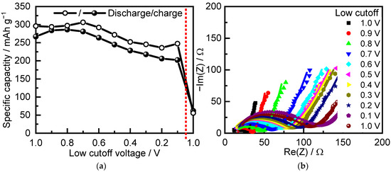 In order to choose an appropriate voltage interval for cycling of all TNO samples, we first investigated the electrochemical performance of pristine TNO in different voltage ranges from 3 to 1 V and then reducing the low cutoff by 0.1 V with each cycle (Figure 5). The initial charge–discharge specific capacity, when cycled to 1 V, was 296/267 mAh g−1. When the low cutoff decreased to 0.8 V, the specific discharge and charge capacities slightly increased. When the low cutoff decreased to below 0.8 V, the capacity decreased, most probably because of side reactions of the electrode with the electrolyte. This was accompanied by a notable increase in resistance, registered by in situ EIS in the frequency range of 10 kHz–100 mHz (Figure 5b). The reduced capacity was maintained even after returning to the 1 V cutoff (see value of capacity after red dashed line in Figure 5a).