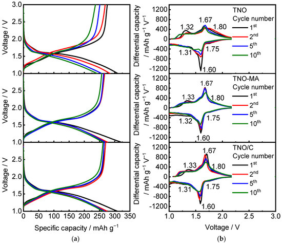 (a) Charge–discharge profiles and (b) differential capacity vs. voltage plots for TNO, TNO-MA, and TNO/C.