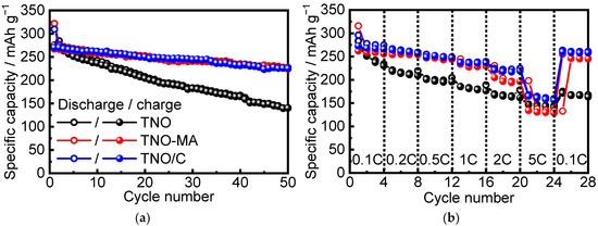 Figure 7 shows the charge–discharge specific capacity of TNO, TNO-MA, and TNO/C vs. cycling number and cycling rate. The initial discharge capacities at a C/10 rate were equal to 310 mAh g−1 for TNO, 322 mAh g−1 for TNO-MA, and 309 mAh g−1 for TNO/C, which were close to the theoretical capacity (387.7 mAh g−1). The initial charge capacities were 276, 267, and 270 mAh g−1 for TNO, TNO-MA, and TNO/C, respectively. Therefore, the irreversible capacities were equal to 34 mAh g−1 (11%), 55 mAh g−1 (17%), and 39 mAh g−1 (13%) for TNO, TNO-MA, and TNO/C, respectively, probably arising from the formation of a solid electrolyte interface (SEI). According to [24], a thin SEI layer was formed during the first discharge, although the operating voltage is higher than 1.0 V. Meanwhile, it was partially dissolved during the first charge in the voltage range of 1.0–3.0 V. After 50 cycles, the reversible capacity stabilized at 140 mAh g−1 for TNO, at 224 mAh g−1 for TNO-MA, and at 225 mAh g−1 for TNO/C, with Coulomb efficiency of ~99%. When the cycling rate increased from C/10 to 5C, the highest capacity (168 mAh g−1) was observed for TNO/C as a result of decreased particle size, uniform particle size distribution, and increased electronic conductivity due to formation of a conductive carbon matrix.