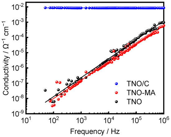 The impedance spectrum of the TNO/C sample showed a frequency-independent character, indicating that it had electronic conductivity with a high value of 8.67 × 10−3 S·cm−1. On the other hand, the curves for TNO and TNO-MA had a sloping form. Approximating their intersections with the x axis allowed obtaining values of conductivity equal to 4.32 × 10−11 S·cm−1 for TNO and 4.10 × 10−11 S·cm−1 for TNO-MA (Figure 8).