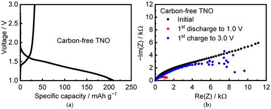 Interestingly, pristine carbon-free TNO mixed only with the binder with a ratio of TNO/PVDF = 95:5 intercalates Li ions during the first discharge at C/10 cycling rate (Figure 9a). The initial discharge capacity was equal to 210.37 mAh g−1. Note that TNO showed a clear insulating character with a wide band gap of ~3 eV [22,25]. The conduction band was contributed by d states of Nb and Ti atoms. The valence band was mostly contributed by p states of oxygen atoms [22]. During lithium intercalation, electrons from ionized Li ions partially occupied the conduction band of TNO, which led to a significant increase in the Fermi level of the system and metallic electronic conduction as a consequence [13,22,25]. The authors of [13], using magnetic measurements, showed that the electronic conductivity of TNO increased by seven orders of magnitude upon lithiation (n-type doping) and indicated that electrons exhibited both localized and delocalized character near the composition of Li0.60TiNb2O7. They established that the proportion of localized electrons was the largest at low lithium content, while at high lithium content, most electrons were delocalized. It is obvious that n-doping of the insulating d0-TNO by electrochemical reduction increased the concentration of carriers to turn it into an effective conductor. The discharge capacity was 210 mAh g−1, which was close to the discharge capacity of TNO with a conductive additive. However, the charge capacity of carbon-free TNO was only 32.5 mAh g−1. Figure 9b shows in situ EIS spectra of the pristine and carbon-free TNO after its discharge and charge. The resistance of carbon-free TNO after discharge became much smaller than that of pristine material; however, it significantly increased on charge. A similar phenomenon was described in [25]. The authors assumed that upon the initial discharge, a thin layer of electronically conductive phase LixTiNb2O7 was formed, while when charged, a nonconductive delithiated phase was generated on the surface of the TNO particles, which prevented the deintercalation of Li ions.