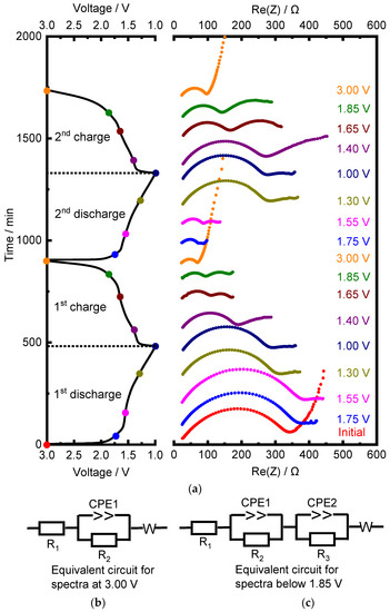 In situ EIS spectra were recorded for TNO at different states of charge and discharge. Figure 10 shows charge–discharge profiles for the first two cycles and how the impedance spectra changed at different voltages (marked with colored dots on the cycling curves). At the first discharge, the resistance increased from 308 Ω at the initial state to 369 Ω at 1.55 V. Next, it decreased to 282 Ω at 1.00 V. Upon the first charge, an extra semicircle appeared in the middle frequency range at voltages below 1.85 V, which most probably corresponded to the charge transfer. The resistance decreased until the end of the charge from 282 Ω at 1.00 V to 36 Ω at 3.00 V. At the second discharge, it increased slightly from 36 Ω at 3.00 V to 57 Ω at 1.55 V and then increased sharply to 270 Ω at the end of discharge. The changes upon the second charge were similar to those upon the first one: the resistance decreased from 270 Ω to 58 Ω. In Figure 10b,c, two equivalent circuits are present. The first describes the impedance spectra of TNO before cycling, while the second describes the impedance spectra of TNO upon the first charge at 1.85 V. R1 corresponds to the electrolyte resistance. The high-frequency semicircle is a parallel connection of the constant phase element CPE1 and resistance R2, which was attributed to the surface film formed on the anode [26,27]. The parallel connection of CPE2 and R3 describes a middle-frequency semicircle corresponding to charge transfer. In the low-frequency region, a straight line corresponds to the Warburg diffusion impedance W. Similar results for the second cycle were obtained by other authors [26,27,28,29]. The authors of [13] showed that lithium mobility was hindered at high Li content (i.e., at x > 3 in LixTiNb2O7) because of a transition from interstitial-mediated diffusion to vacancy-mediated diffusion.