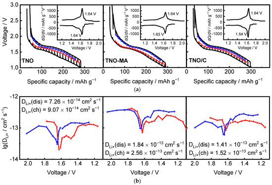 Figure 11 shows the GITT and OCV curves and the calculated Li+ diffusion coefficient DLi+ as a function of the cell voltage during charge and discharge of TNO, TNO-MA, and TNO/C at room temperature. The average value of DLi+ for discharge/charge of TNO was 7.26 × 10−14/9.07 × 10−14 cm2 s−1. The average values of DLi+ for TNO-MA and TNO/C were greater than that for TNO and were equal to 1.84 × 10−13/2.56 × 10−13 cm2 s−1 and 1.41 × 10−13/1.52 × 10−13 cm2 s−1, respectively. For all the samples, DLi+ curves had a minimum corresponding to the plateau at 1.6 V characteristic of a two-phase Li+ intercalation mechanism, where the interface between two coexisting phases worsens the conditions for Li+ diffusion. This was comparable to data from the literature [13,30,31,32,33]. GITT measurements revealed that the values of DLi+ in TNO-MA and TNO-C were one order of magnitude higher than that in TNO and confirmed that the chemical diffusion coefficient of Li+ during the delithiation was higher than that during lithiation at high lithium concentration.