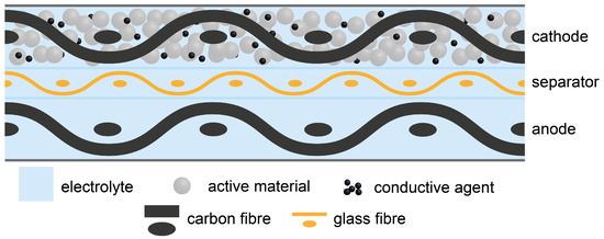 34]. No further anode half cell tests with the structural separator have been conducted, because significant problems with lithium dendrite formation were observed in the cathode half cell tests. In contrast to the findings known in literature, the carbon fibres were coated with an all-solid-state electrolyte. The wetting of the carbon fibres with an all-solid-state electrolyte seems to be insufficient compared to an electrolyte with liquid components. The cross section of a structural anode is depicted in