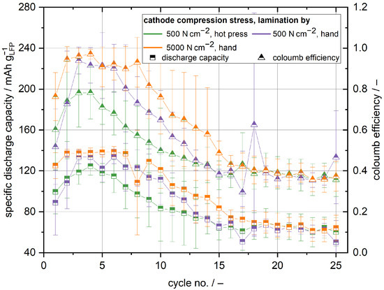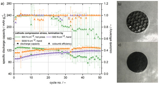 Figure 2. Lamination and compression pressure directly influence the cycling capacity of the cathode half cells. Comparing the initial cycle of the manually laminated cells, the cathodes compressed with 5000