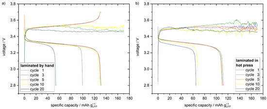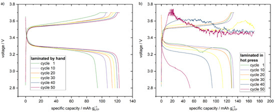 Figure 6. The manually laminated cells reach the cut-off voltage for the charging step in the first cycles, but during the successive cycles the voltage becomes noisy in the charging step. Similar to the cathode half cells with the polymer film separator, which have been laminated in the hot press, the voltage noise is accompanied by a degradation of the discharge capacity. The cells that have been laminated in the hot press never reach the cut-off voltage in the charging step and exhibit even faster capacity degradation.
