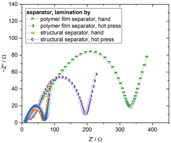 Figure 5. While there is a significant difference in cell impedance for the cells with the polymer film separator between the manual lamination and lamination in the hot press, there is no meaningful difference when the cells with the structural separator are compared against each other. The impedance of the different cells with the structural separator is smaller than the impedance of the cells with the polymer film separator laminated in the hot press, further supporting that better interface contact is the main reason for the observed higher capacities. Moreover, the polarisation of the manually laminated cells with the structural separator at a state of charge equalling to 20