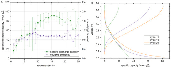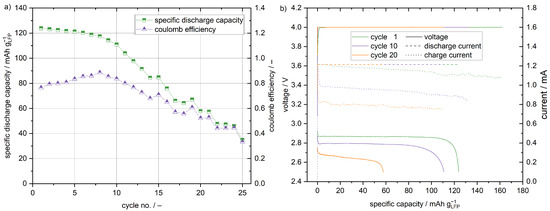 33]. However, in contrast to the half cell setup, only the lithium in the active material is available for the energy storage and conversion, so that the lithium supply is limited. Lithium depletes and the capacity decreases with increasing cycle number.