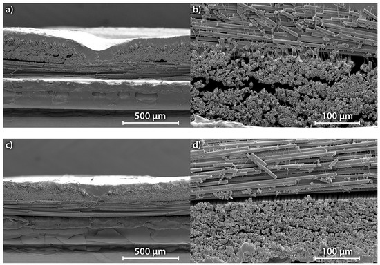 . Taking into account the density of the carbon fibres and the coated cathode materials, this corresponds to a fibre volume content of 64%. No difference of the fibre volume content could be detected between the cathodes compressed at 500